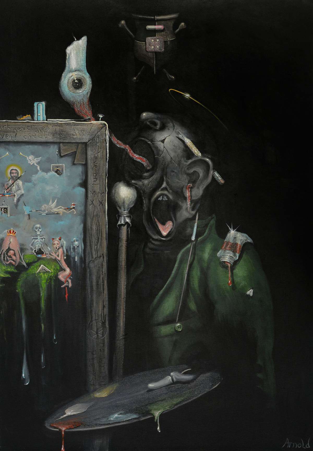 My paintings evolve organically, often emerging as an automatism. However, it is not uncommon for me to not understand the meaning of a painting until months after its completion. That is why many of my paintings turn out to be autobiographical. Real art is able to convey the intention to the viewer even when the artist is no longer there. Hopefully autobiographical, but not yet. This work belongs to a series of three, The Dead Artist, Diary of a Clown, and Camouflage.